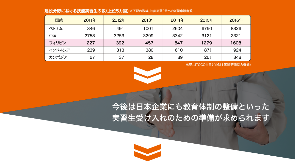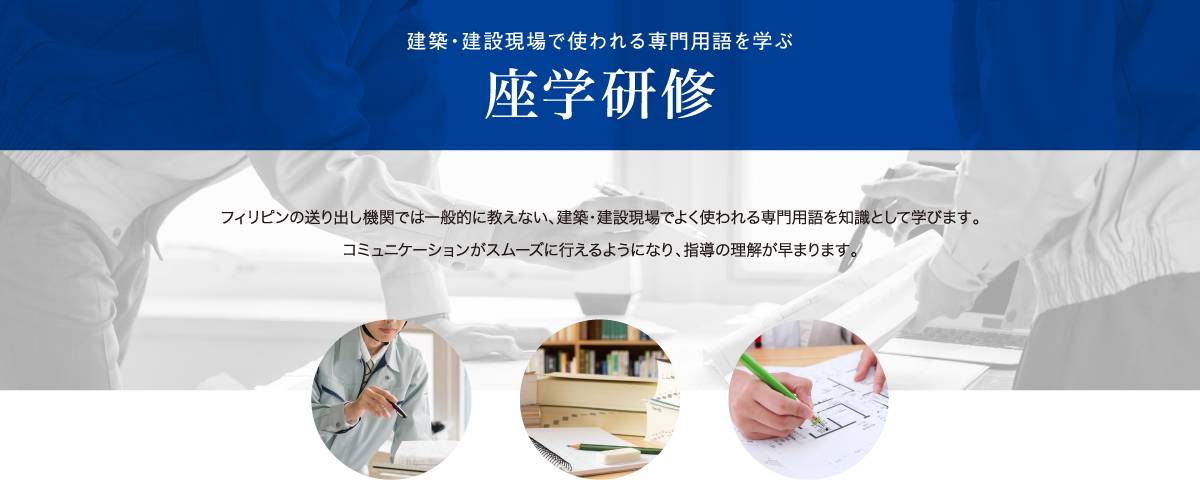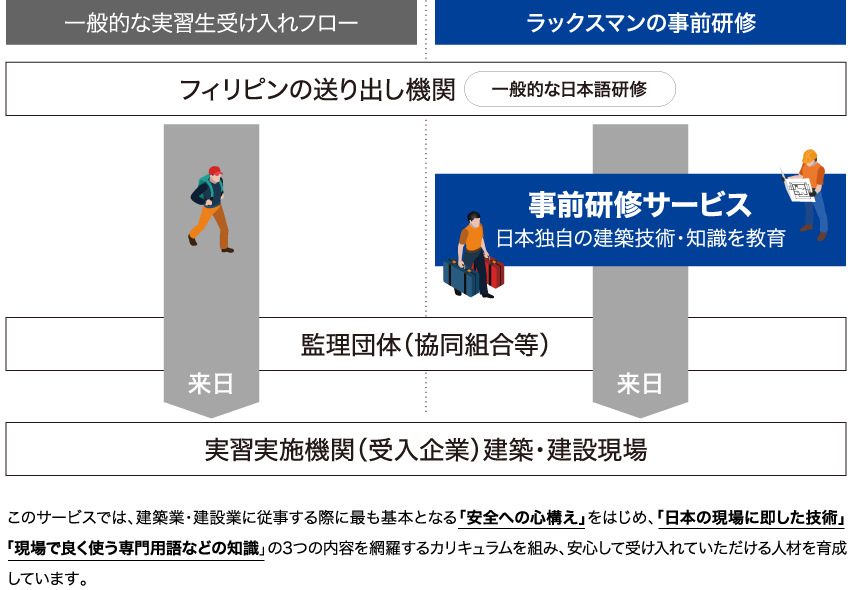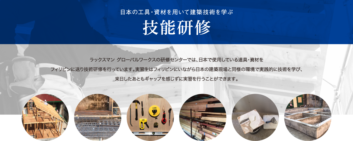 ラックスマン グローバルワークスではフィリピン人技能実習生に対して、来日前に建築業・建設業に関する研修を行っております。現在の制度では外国人技能実習生に対する日本語研修はフィリピンの送り出し機関が行っているものの、専門分野に関する基礎的な教育は受け入れ企業に任されています。その基礎教育を請け負うことで、現場での指導の負担を軽減し、実習生の早期独り立ちに貢献するのが「建築・建設特化型 外国人技能実習生 事前研修サービス」なのです。